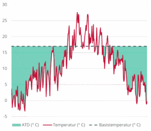 Die sogenannte Akkumulierte Temperaturdifferenz ATD (SIA 380:2022; Anhang F) gibt an, wie stark und wie lange in einer Periode geheizt werden musste. Dafür wird die Differenz zwischen der Basistemperatur und den tatsächlichen täglichen Aussentemperaturen berechnet. Positive Differenzen werden aufsummiert – je grösser die Summe, desto mehr Heizbedarf bestand in der jeweiligen Berichtsperiode.